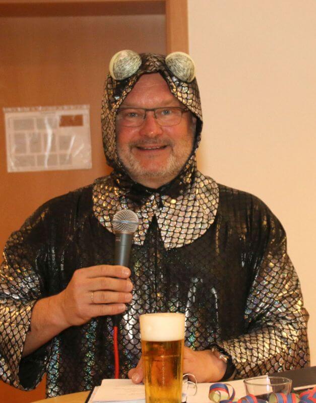 Die Stammbesucher wussten was gemeint war. Einmal mehr hielt Ex-SCF-Vorsitzender Dirk Pfannmüller die traditionelle Heringsrede in der er in gereimten Versen das Heringsessen beschrieb: „Du setzt dich ohne, dess de rennst, nebe all die Leut‘, die du schon kennst, denn die Tisch‘ sind nummeriert, dann gibt’s Hering – all you can eat.“