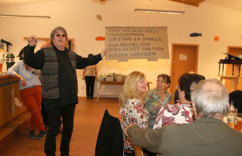 Es folgte ein besonderes „Warm up“. Auf zwei großen Pappkartons hatte Schnur einen Text über das Heringsessen geschrieben. Eine Saalhälfte sang einen Textteil auf die Melodie der „Vogelhochzeit“, die andere ihren Text auf „Freude, schöner Götterfunken.