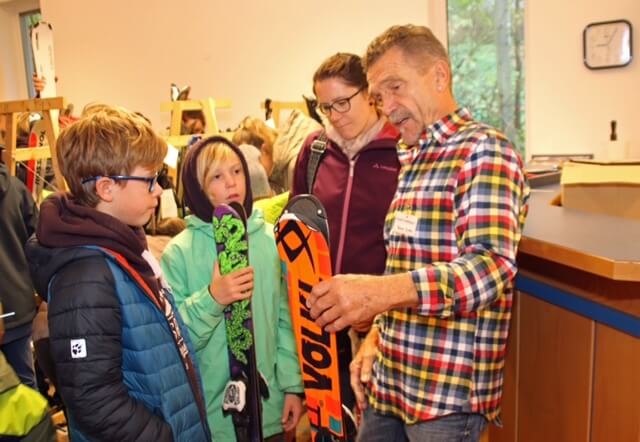 Zydek berät die Familie, die zum dritten Mal dabei ist. „Du musst bedenken, dass Skistöcke im Schnee einsinken“, erklärt Zydek Tom, warum er nach etwas längeren Skistöcken schauen soll. Die ersten ausgesuchten Paar Ski schaut sich Zydek auch von unten an. „Der Belag ist wichtig“, sagt er, während Vater Torsten Nachschub bringt. „Wir finden hier jedes Jahr was“, sagt Torsten Müller. „So soll es ja sein“, freut sich Zydek.
