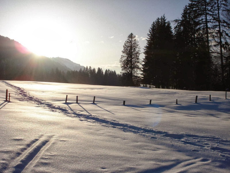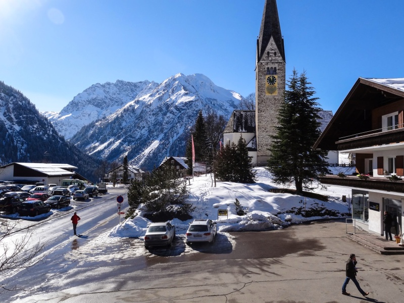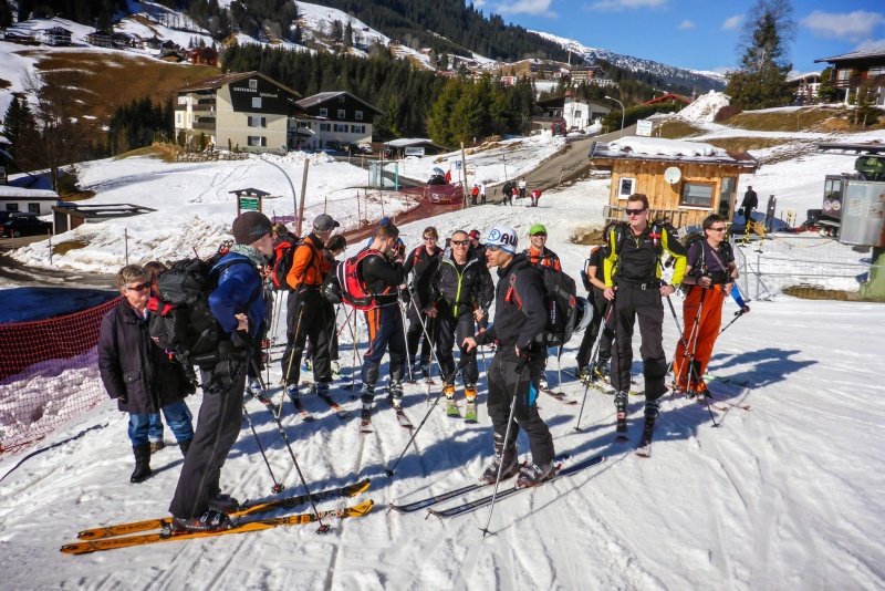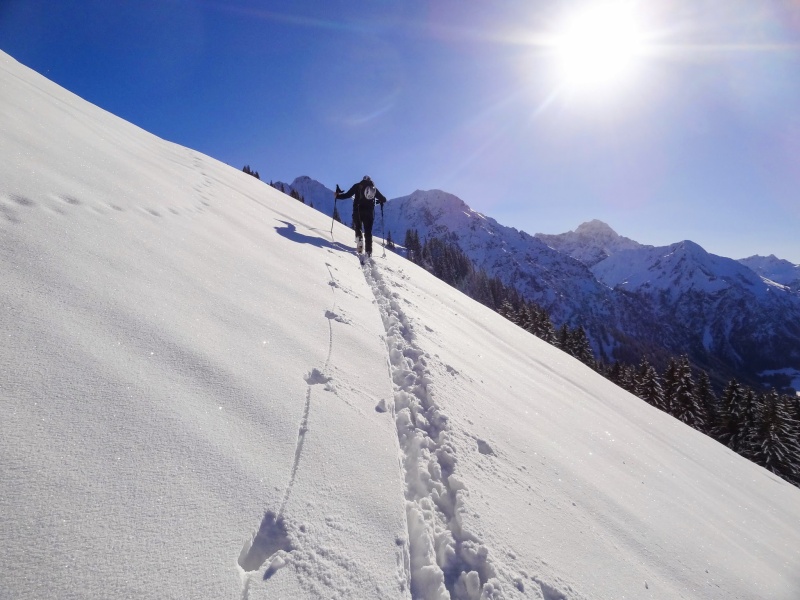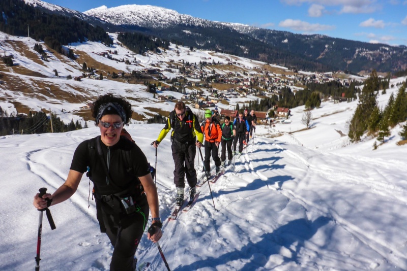 Nach der Anreise bis zum Mittag stand noch eine kleine Nachmittagsskitour auf dem Programm. Direkt vom Hotel ging es gemeinsam erst ein paar Meter zu Fuß mit den Skiern auf den Schultern abwärts, über die Breitach, ehe wir beim Höfel Lift die Skier anschnallen konnten. In zwei Gruppen stiegen wir auf die Kuhgehrenspitze (1910m). Die frühlingshaften Bedinungen trieben uns die ein oder andere Schweißperle auf die Stirn. Diese milden Temperaturen mit einer herrlichen Nachmittagsstimmung ließen aber die Anstrengungen am Gipfel schnell vergessen. Anbetracht der teilweise mageren Schneelage im Aufstieg, es gab kurze und etwas schlammige Tragepassagen, entschieden wir uns Richtung Norden abzufahren. Dort gab es noch Pulverschnee, ehe wir auf die schneesichere Talabfahrt des Kanzelwandskigebietes kamen. Der Rest war dann kein Problem mehr, wir wurden sogar von der Pistenkontrolle ins Tal begleitet.