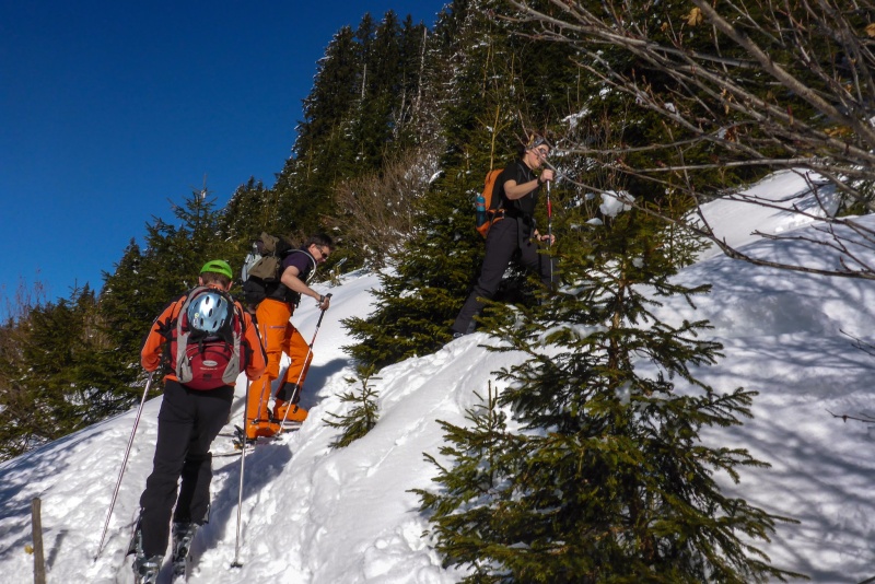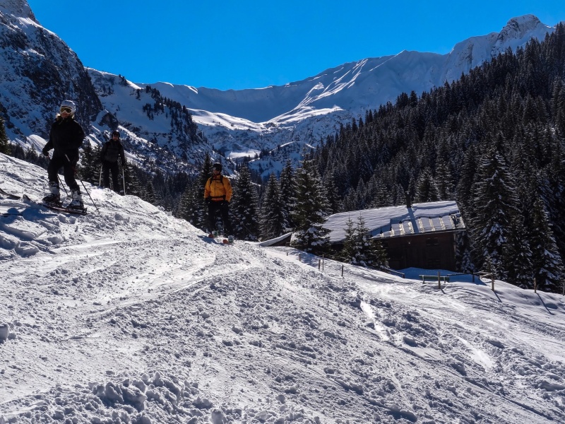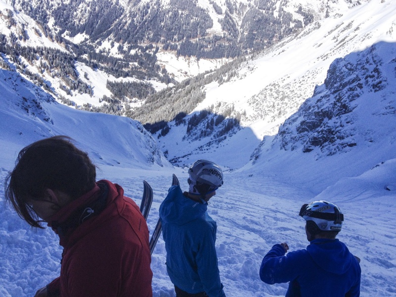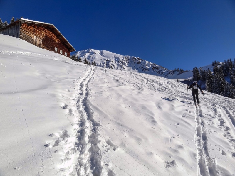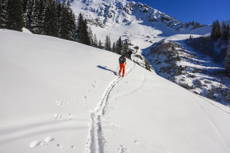 Das Wetter am Abschlusstag wurde noch besser. Ein Traum in Weiß-Blau. Jedoch sollten wir von der direkten Sonneneinstrahlung verschont bleiben. Es ging in das Karlstor von Baad aus. Die Sonne des Vortages hatte nämlich alle sonnenbeschienen Pulverhänge anfirnen lassen, was bei den kalten Nachttemperaturen zu einem Harschdeckel führte. Im Karstor, einem nordseitigem Kar im Schatten des großen Widdersteins erhofften wir uns noch ausreichend Pulverschnee. Durch das Bärgundtal stiegen wir erst auf einem Forstweg, dann über flache Hänge auf, ehe der große Schlussanstieg wartete. Diesen meisterten alle, trotz einiger Blasen an Füßen und einer Menge Spitzkehren. Aber spätestens bei der Pulverabfahrt waren die fehlende Sonne und die Aufstiegsmühen vergessen. Ein lohnender Abschluss für die vier erlebnisreichen Skitourentage.
