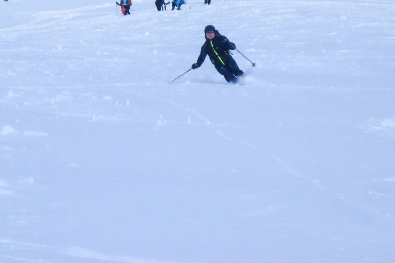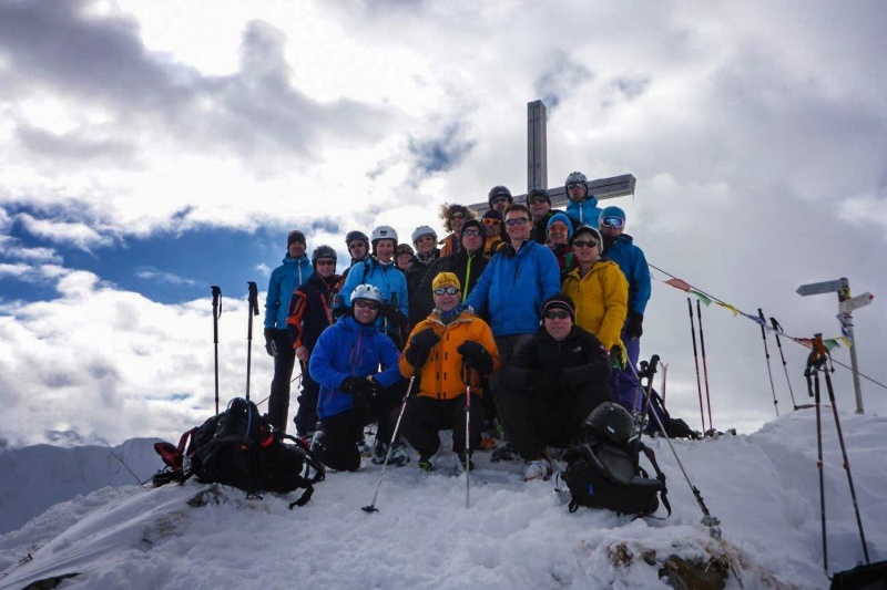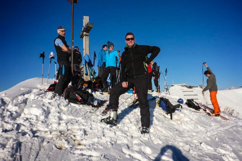 Der Samstag versprach Wetterbesserung, nach dem Schneefall des Vortages war uns das natürlich recht. Es stand wieder eine reine Skitour an. Unser Ziel für den Tag der Steinmandl (1982m). Mit Skibus ging es zur Talstation der Ifen Lifte. Diese Mal aber ließen wir diese links liegen und durch den frisch verschneiten Winterwald ging es über Melköde und Schwarzwasserhütte auf den Gipfel. Wir hatten Glück und nur ein paar Abfahrtsspuren waren bereits vorhanden. Die komplette Gruppe war am Gipfel und genoss die Abfahrt im Pulverschnee. An der Schwarzwasserhütte kehrten wir ein, um zu testen, ob die Kaiserschmarrnportionen immer noch so üppig sind. Es stimmte, aber diese Stärkung war nötig, schließlich wartete noch ein Aufstieg zur Ochsenhofer Scharte. Die letzten Meter dorthin waren etwas mühselig und mussten ohne Skier bewältigt werden. Gemeinsam wurde aber auch diese Stelle gemeistert, Trittstufen wurden getreten und die ersten halfen den Nachfolgenden, indem Skier übernommen wurden. Von dort fuhren wir in der Nachmittagssonne Richtung Baad ab. Ein paar gönnten sich noch den Aufstieg auf das Grünhörn (2035m) und folgten dann ebenfalls nach Baad. Ein erlebnisreichen Skitag haben wir in der Hotelbar mit Olympia schauen ausklingen lassen. Leider ohne Medaille im Slalom, das störte uns aber heute nicht mehr.