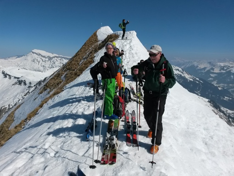 Am Gipfel war alles vergessen. Strahlend blauer Himmel, fantastische Fernsicht und alle Mann und Frau glücklich. Aber da war ja noch die Sache mit dem Skibus. Nach einer kurzen Rast wurde abgefellt und es ging durch ein langes Tal auf hart gefrorenem Schnee in ruppiger Fahrt Richtung Schoppernau. Auf einem Forstweg entlang dem Schrecksbach wurde die Schneedecke immer dünner, aber wir konnten bis ins Tal abfahren und haben den Bus pünktlich erreicht.