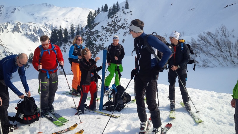 Mittagspause im T-Shirt auf der Sonnenterrasse des Skigebiets Hochtannberg. Frisch gestärkt ging die Gruppe die letzten 300 Höhenmeter zum Hochalppass an. Wir durchschritten eine wunderschöne Hochebene am Fuß des Großen Widderstein. Bei weicheren Schneebedingungen ging es in zwei Gruppen durch das Bärgunttal Richtung Kuchen und Schlag. Die Bärgunthütte hatte nämlich diesmal geöffnet und man konnte die letzten Sonnenstrahlen mit einem Bier in der Hand genießen. Nach so einer eindrucksvollen Tour kann man dann auch schon mal seinen Helm auf der Hütte vergessen, aber es findet sich zum Glück immer eine Touren-Kollegin, die alles einsammelt und abends wieder verteilt. Nach dieser Gewalttour waren alle berechtigt sehr stolz. Ein Großteil der Tourengeher lag um 21 Uhr selig im Bett.