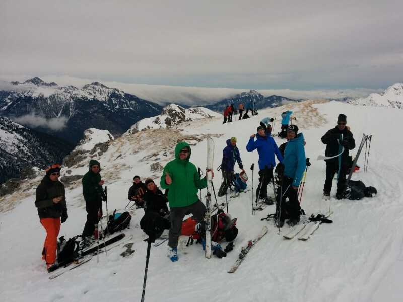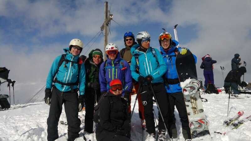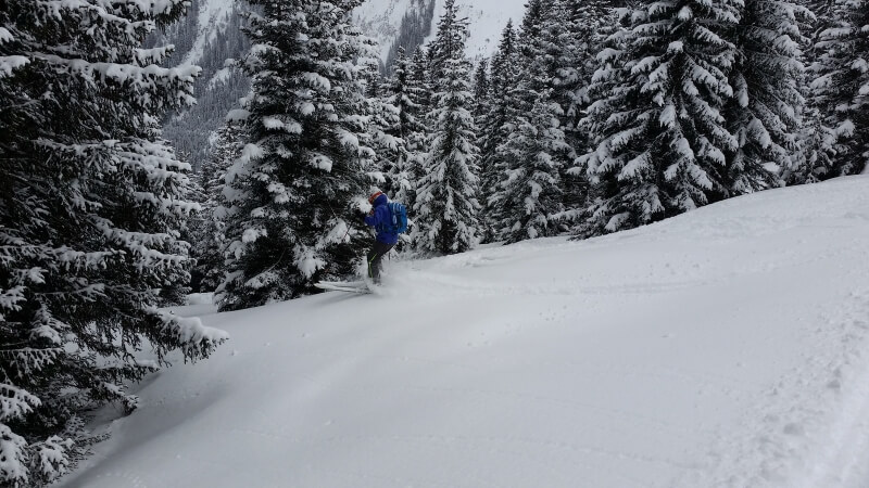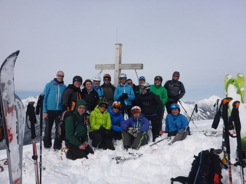 Die Schneesituation erforderte Entspannungsabstände zwischen den einzelnen Tourengehern und somit hatte man auch ausreichend Zeit zum Verschnaufen. Am Gipfel angekommen verzog sich leider die Sonne und es wurde schnell ungemütlich kalt. Bei der Abfahrt entlang der Aufstiegsrute, anfänglich ebenfalls mit Sicherheitsabstand, konnte der eine oder andere Schattenhang mit Powder ausgekostet werden. Richtig Spaß machte das Umkurven der Latschenkiefern im kniehohen Pulverschnee.