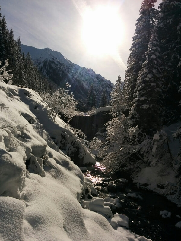 Nachdem es die ganze Nacht dicke Flocken geschneit hat, brach eine kleine Gruppe bei besten Schneeverhältnissen zur Abschluss-Tour auf. Die Autos wurden oberhalb des eigentlichen Parkplatzes in Rinnen geparkt, um nicht doch noch die Schneeketten benutzen zu müssen.