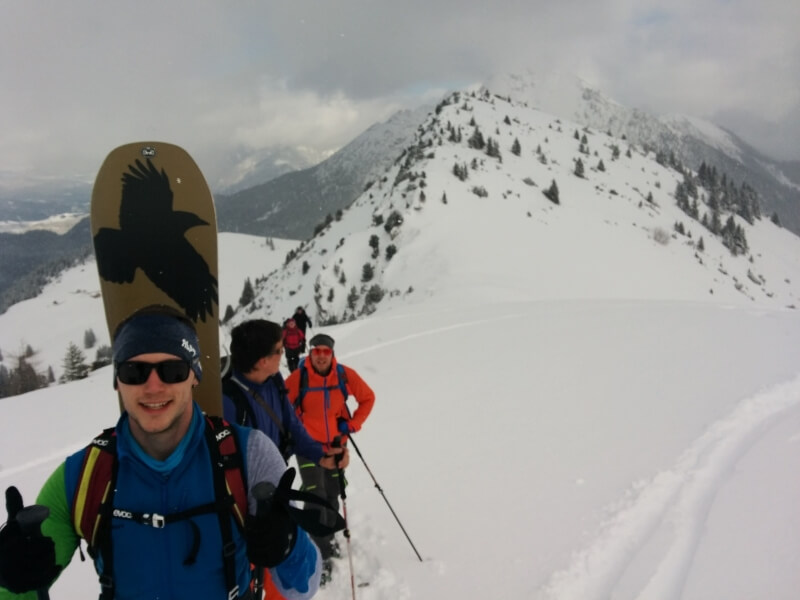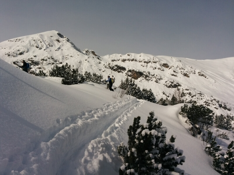 Nach einer Brücke ging es steil in den Wald. Auf einer flachen Wiese konnte sich der Puls nochmal etwas beruhigen, bevor die Gruppe weiter zwischen Latschenkiefern auf der linken Seite des Tales Richtung Gipfel wanderte. Das Spuren im frischen aber schweren Schnee (Südosthänge) war unglaublich anstrengend. Schließlich wurde ein Hochtal erreicht und der breite Gipfelhang lag vor uns.