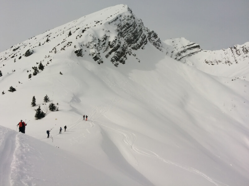 Über einen Südhang mit sehr dünner Schneedecke ging es auf breiten Schneisen durch lichten Bergwald. Im oberen Teil wird der unscheinbar wirkende freie Bergrücken immer schmaler und wer mit der Spitzkehrentechnik noch nicht so vertraut war konnte sie hier ausgiebig üben.