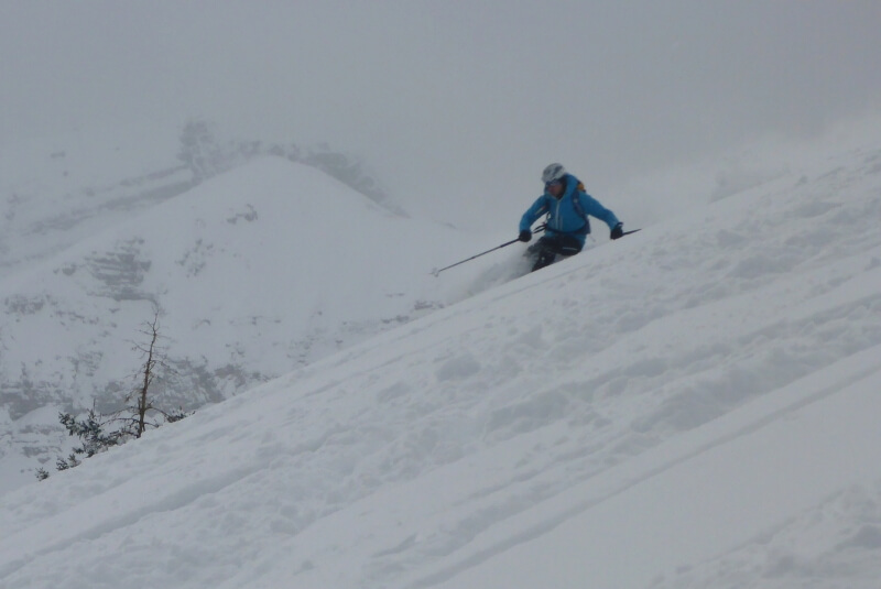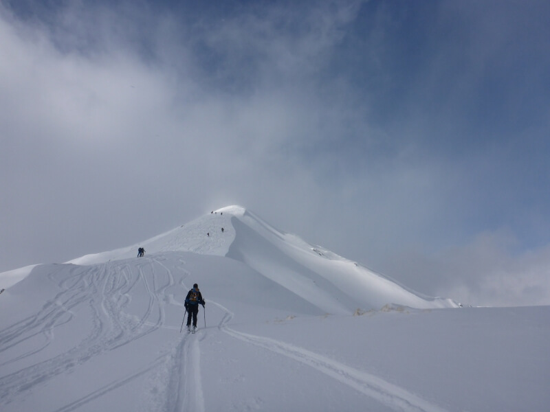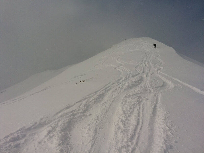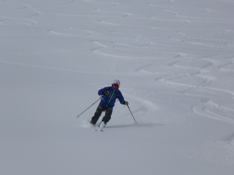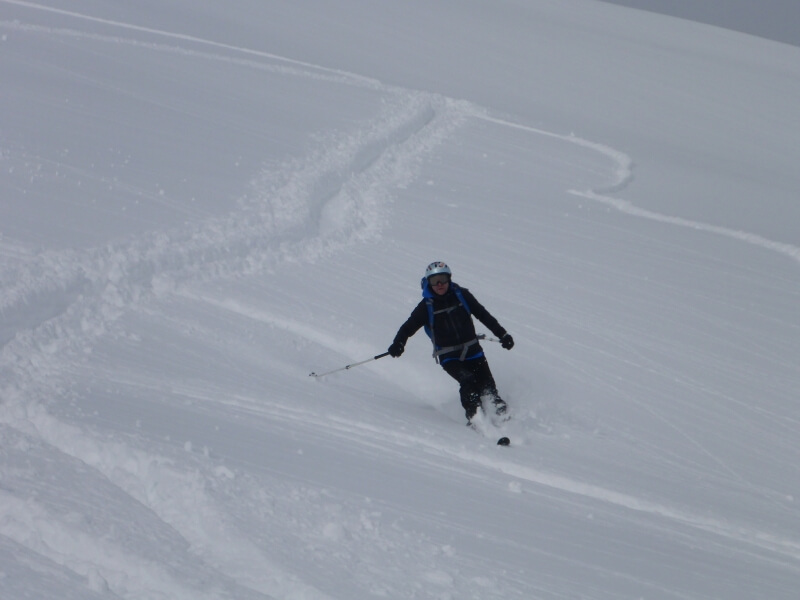 Die Abfahrt erfolgte nahezu über die Aufstiegsstrecke. Nach dem schmalen Gipfelgrad machte die Gruppe einen Abstecher nach links über einen breiten Hang mit wunderbarem Tiefschnee.