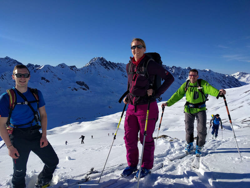 Oben angekommen ging es nun endlich los. Die LVS-Pieps Kontrolle wurde durchgeführt und wir verließen das gesicherte Skigebiet. Die Uhr zeigte 15:38 und manche sind vor über 5 Stunden in Ischgl angekommen. Dann hätten wir ja auch hochlaufen können ;-) Die Variantenabfahrt blieb ihrem Namen nicht immer treu und an vielen Stellen musste mit Stockeinsatz geschoben werden. Was unserem einzigen Snowboarder nicht gerade ein Lächeln ins Gesicht zauberte. Dann war aber endlich die Hütte in Sicht. Da für den Samstag sehr unbeständiges Wetter gemeldet wurde entschied sich unser Tourenführer Christian noch spontan für einen kleinen Aufstieg. Die Felle wurden aufgezogen und wir stiegen 200 Höhenmeter in der wunderbaren Abendsonne auf. Im Vergleich zum recht homogenen Aufstieg zeigte die Gruppe in der Abfahrt doch deutliche Leistungsunterschiede. Schlussendlich kamen wir aber alle kurz vor 18 Uhr in der Hütte an. Bis zum Essen wurde die Zeit mit Nachbereitung verbracht. Nach dem Essen kam dann auch das Gepäck und wir bezogen unsere beiden 6’er Zimmer. In gemütliche Runde klang der Tag aus.