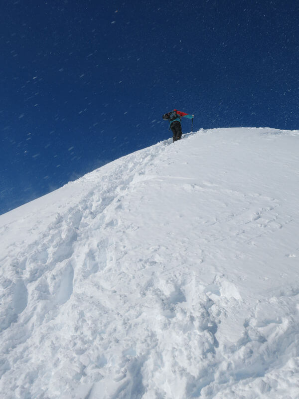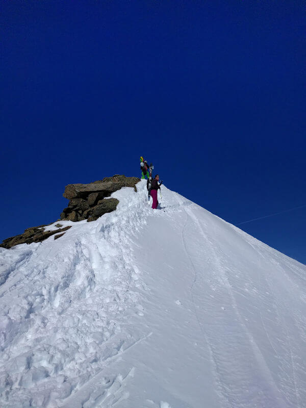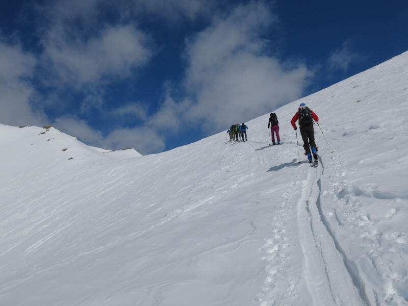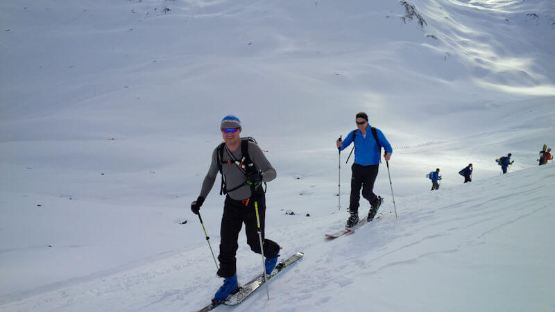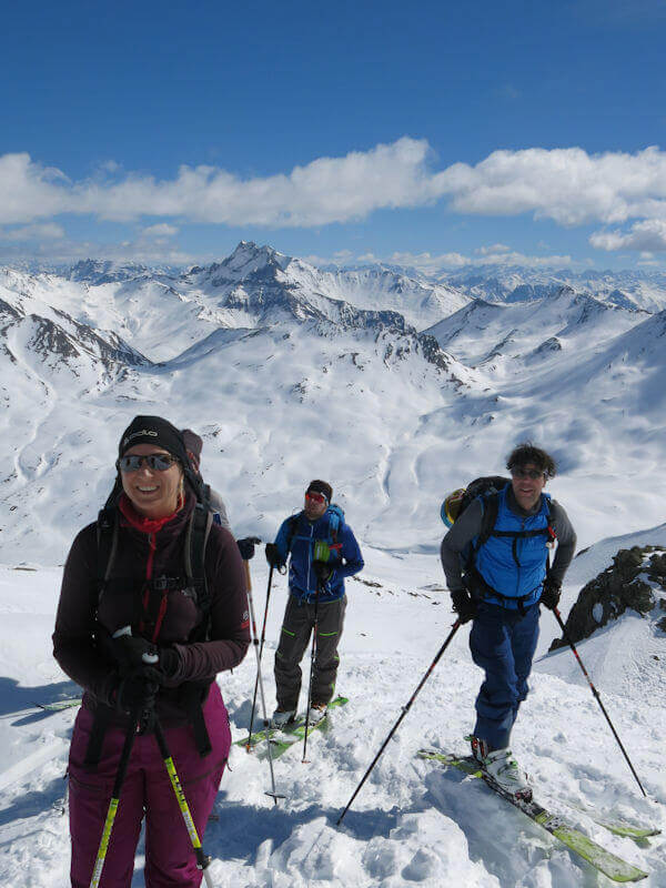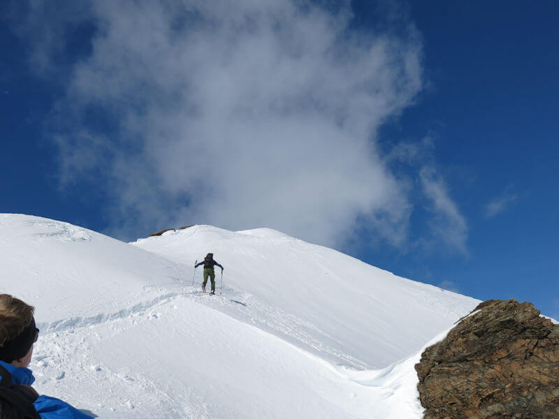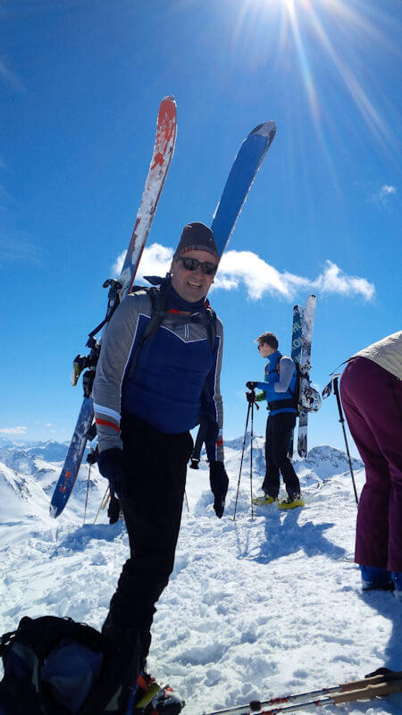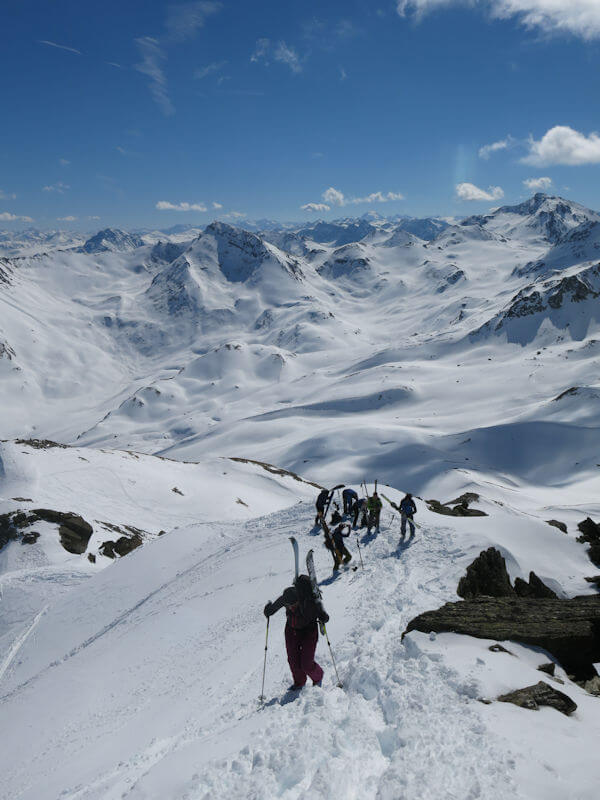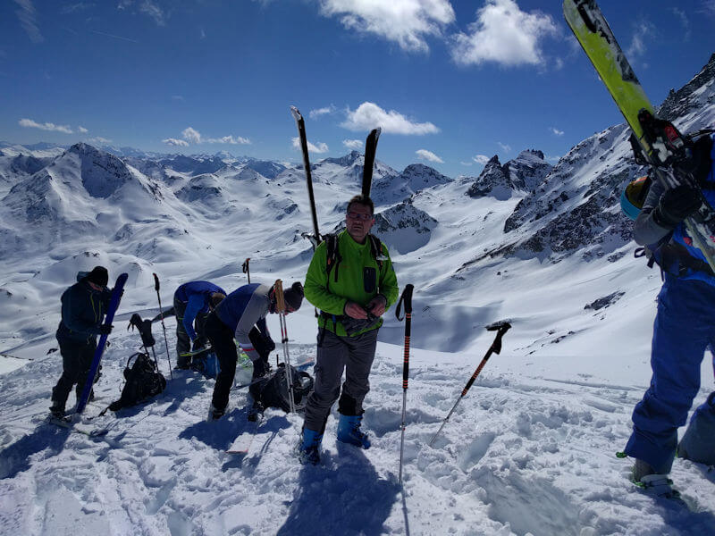 Der erste Blick aus dem Fenster zeigte, heute wird ein Spitzentag. Es blieb bei der am Abend festgelegten Tour auf den 3009 Meter hohen Piz Larain. Die Höhendifferenz betrugen 745 Meter. Jetzt zeigte sich der Vorteil einer Hütte, da ein elendig langer Zustieg entfällt. Kontinuierlich ansteigend ging es durch herrlich kupiertes Gelände. Das Panorama war durchgehend 5 Sterne Deluxe. Ohne nennenswerte Unterbrechung kamen wir gut voran. Die den meisten gut bekannten Co-Führer, Hecki und Nils, übernahmen im Wechsel die Führungsarbeit. Den Gipfel fast vor Augen verlangte das steiler werdende Gelände ein weitergehen zu Fuß mit den Skiern am Rucksack. Um 10:45 Uhr standen wir alle glücklich und zufrieden am Gipfel. Das tolle Panorama lud ein zur gemütlichen Gipfeljause. Die Sonne war zwar herrlich, doch der leicht auffrischende Wind kühlte einen recht schnell aus und wir bereiteten uns auf die Abfahrt vor. Die ersten Schwünge im steilen Gipfelgelände waren für Einige von uns eine echte Herausforderung. Doch hiervon ließ sich das Führerteam nicht aus der Ruhe bringen und jede Crux wurde gut gemeistert.
