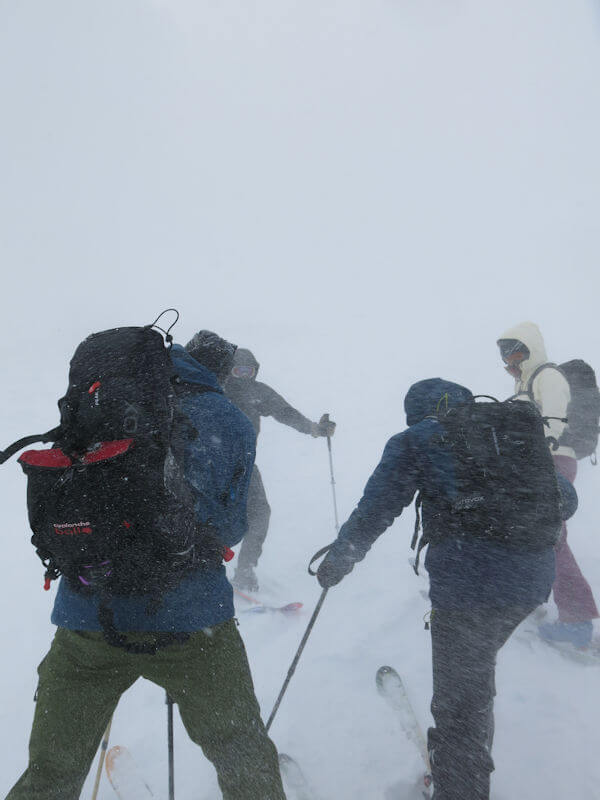 Der Frühstücksraum war genauso voll wie tags zuvor, nur ging es wesentlich ruhiger zu, da bei bei dem Wetter keiner schnell raus auf die Tourenskier wollte. Erstmal abwarten und Tee trinken. Tatsächlich verbesserte sich die Lage bzw. die Sicht und Christian entschied sich zu einer kurzen Tour in unmittelbarer Nähe zur Hütte. So starteten wir in Richtung Piz Davo Sasse. Obwohl das Terrain vom Anreisetag her bekannt war, erschwerte die Sicht das Navigieren doch erheblich. Auf halber Strecke begann dann der Wind weiter aufzufrischen. Obwohl der Gipfel zum greifen nahe entschied sich Christian für einen Abbruch der Tour. Sicherheit geht vor. Der Wind war jetzt so stark, dass selbst Gegenstände wie Skistöcke oder Skier gut gesichert werden mussten. Das Abfellen, Umziehen und Vorbereiten für die Abfahrt bei Starkwind: für viele eine neue Erfahrung. Ohne Sicht ging es wenig rasant und oftmals im Pflug bergab.