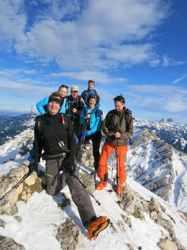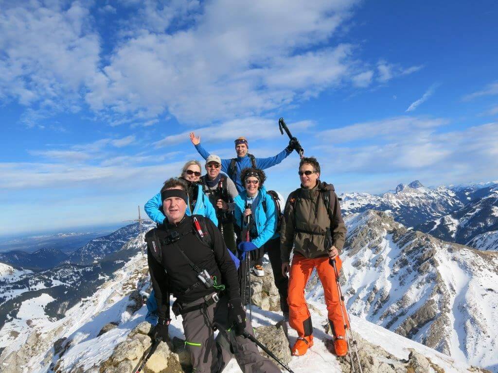 Strahlend blauer Himmel und frostige Luft waren am zweiten Tag die ideale Voraussetzung für unsere Tour auf den Ponten. Von Schattwald im Tannheimer Tal zog sich unsere Spur über einen Waldrücken, dann kreuzten wir einen Lift und eine Skipiste, bevor wir im weiten Tal zwischen Bschießer und Ponten endlich von der Sonne erreicht wurden. Nach ca. vier Stunden hatten wir die 1000 Höhenmeter bewältigt, legten ein Skidepot an und stiegen die letzten Meter zu Fuß auf den Gipfel. Ein überwältigender Rundblick auf die tief verschneiten Allgäuer Alpen und das grüne Alpenvorland in strahlender Sonne belohnte uns. Das Stephans „GoPro“ uns allen aufs Wort gehorchte, erheiterte uns beim Abstieg noch zusätzlich. Nach dem Gipfelhang, auf dem wir Blockwerk und Latschen umkurven mussten, war die restliche Abfahrt auf dem glatten, festen Schnee der reine Genuss. Das Skigebiet Oberjoch lockte auf dem Rückweg noch einen Teil der Gruppe für eine Stunde auf die Piste, der Skipass war in der „Allgäucard“ des Hotels inklusive.
