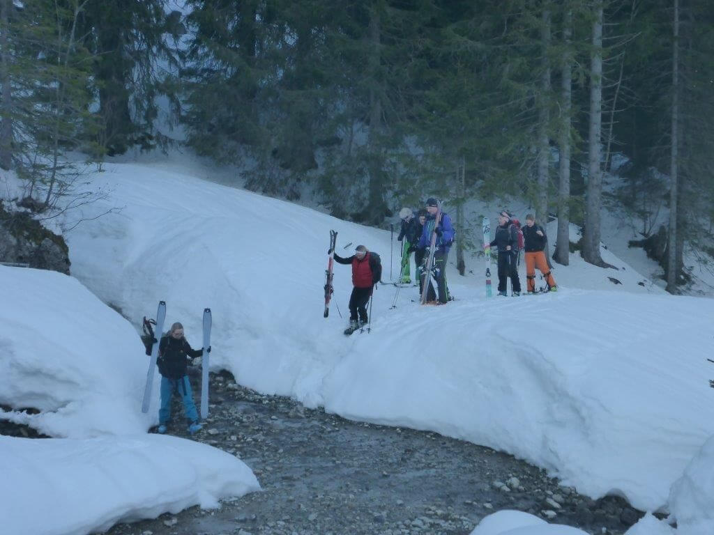 Am zweiten Sonnentag mussten wir unsere Zeiten genauer planen. Die zehn Kilometer Straße zum Giebelhaus im Hintersteiner Tal dürfen nur zu Fuß, mit dem Rad oder dem Linienbus bewältigt werden. Die Zeit für den Aufstieg zum Schochen im Nebelhornkamm war so klar begrenzt. Letzte Busabfahrt 16.10 Uhr, war die klare Ansage. Durch ein flaches Tal stiegen wir an Almhütten vorbei auf. Im freien Gelände konnten wir dann den Gipfel des Schochen sehen und uns hier auch ein Bild davon machen, mit welcher gewaltigen Wucht die Lawinen aus dem gesamten Talkessel in den letzten Tagen durch die Tobel gestürzt waren. Der hart gefrorene Lawinenschnee bremste uns beim Aufstieg, den Gipfel konnten wir nicht mehr erreichen. Durch die anfangs sehr schwierigen Bedingungen für die Abfahrt, viele dicke Lawineneisbrocken waren über den gesamten Hang verteilt, brauchten wir noch reichlich Zeit. – Und das flache Stück danach schien auch immer länger, statt kürzer zu werden. Als wir dann im Giebelhaus vor der Busabfahrt doch noch schnell einen Tee oder eine Schorle trinken konnten, zeigten sich in einigen Gesichtern doch deutliche Erschöpfungsspuren.