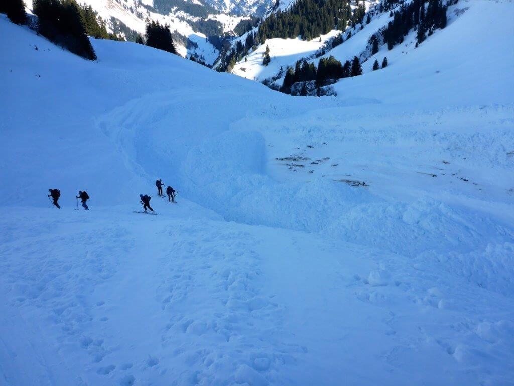 So begann der Lawinenlagebericht für die Allgäuer Alpen am Dienstag, 23. Januar 2018. Am Donnerstag beginnt unser „Skitourenwochenende für Genießer“ im Hotel Sonneneck in Bad Hindelang. An vier Tagen wollen wir in den Allgäuer Alpen weitab der üblichen Pisten im Gelände unterwegs sein. Die Lawinengefahr in allen Höhenlagen wird mit Stufe 4 von 5 bewertet. Müssen wir nun etwa auf die Piste ausweichen??? Doch dann rettete milde Luft und Regen unser Programm! Die Lawinen gingen in der Nacht ab und der starke Regen furchte Rinnen in den Schnee. Fast ohne Risiko konnten wir nun auf unsere Touren gehen.